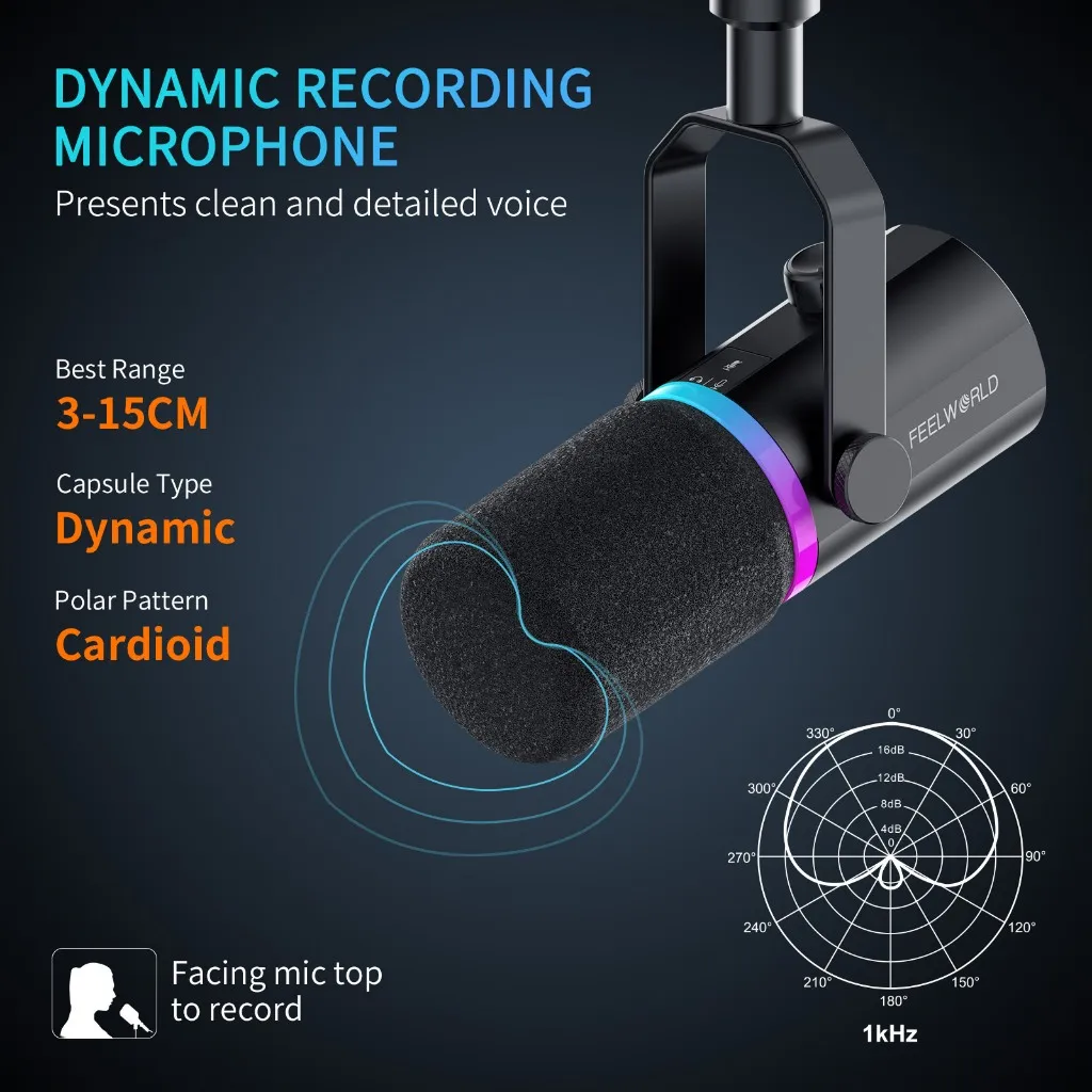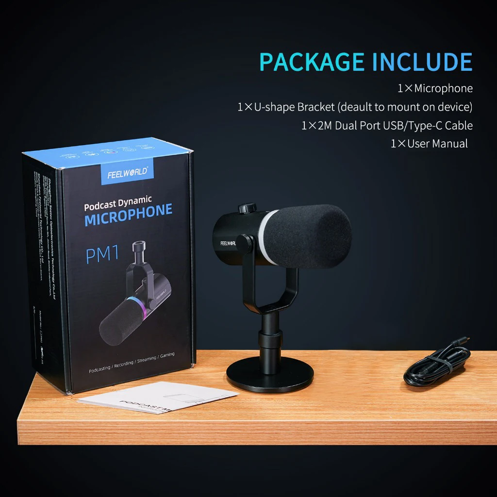 FEELWORLD PM1 with fashionable and compact design, providing natural, clean sound and rich functions. Suitable for various scenario applications, it is ideal for podcast, singer, game player, and voice actors to recording and live streaming.